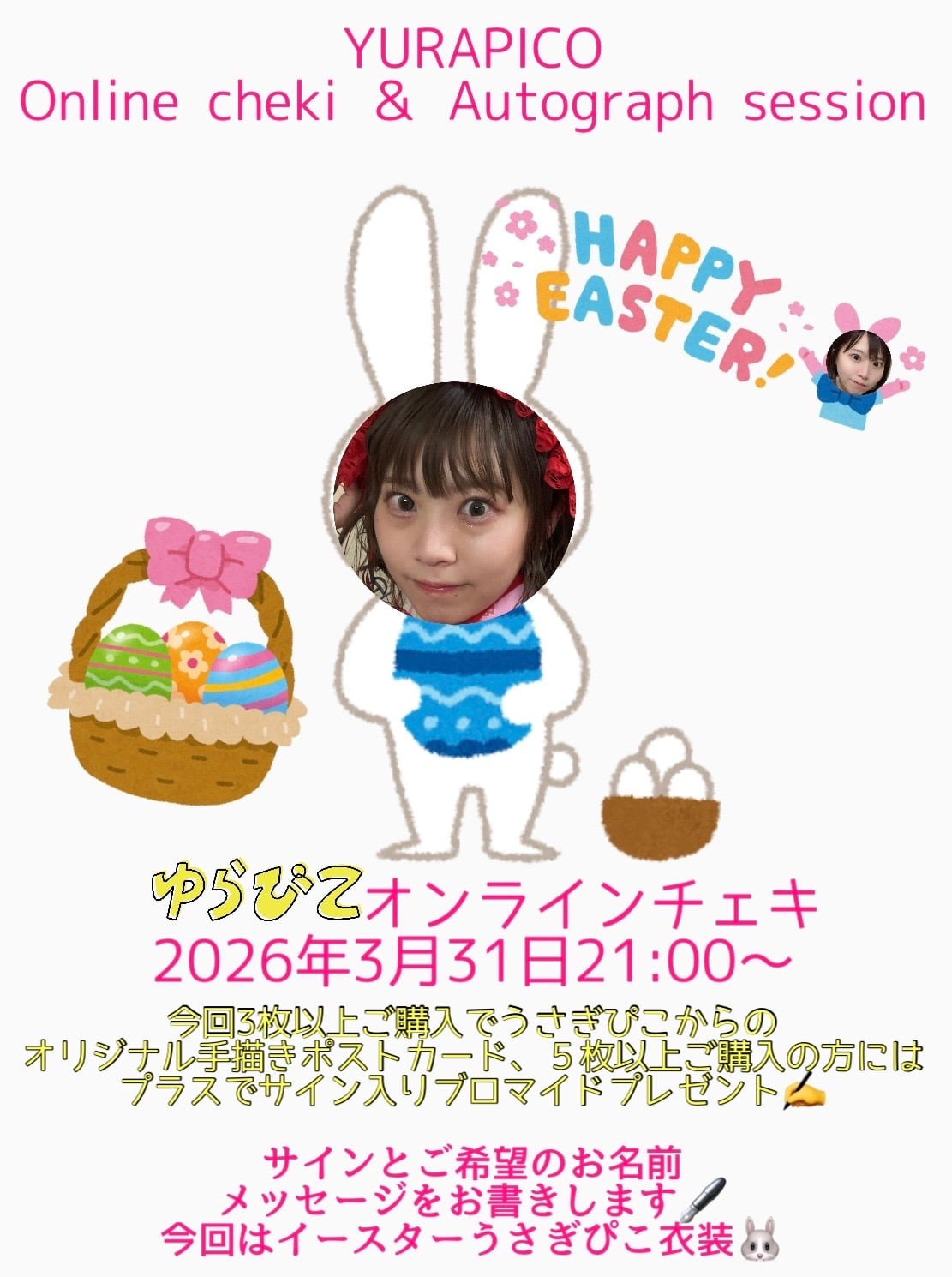 今回3枚以上ご購入の方はゆらぴこからのあなたへのオリジナルイースターうさぎぴこメッセージカードプレゼント!!!5枚以上の方はプラスでサイン入りブロマイドもプレゼント!